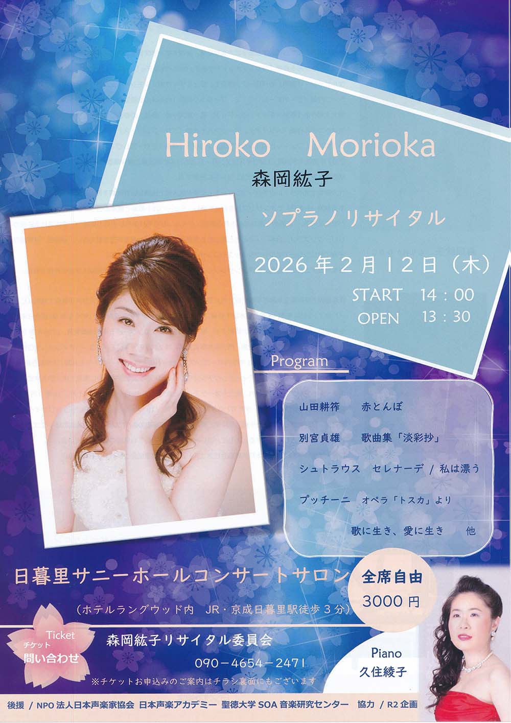 森岡紘子ソプラノリサイタル 日本声楽家協会後援 |