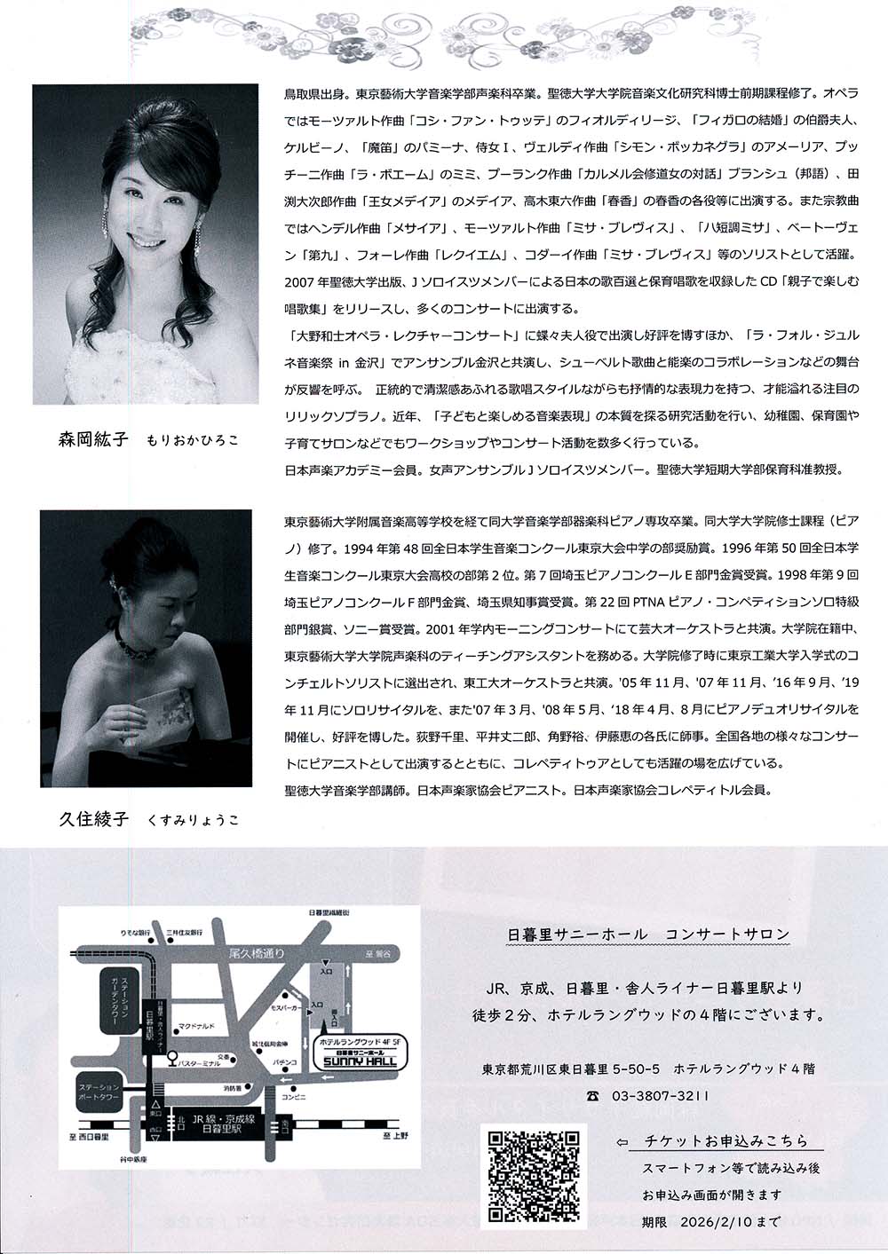 出演 森岡紘子(ソプラノ) 久住綾子(ピアノ) |