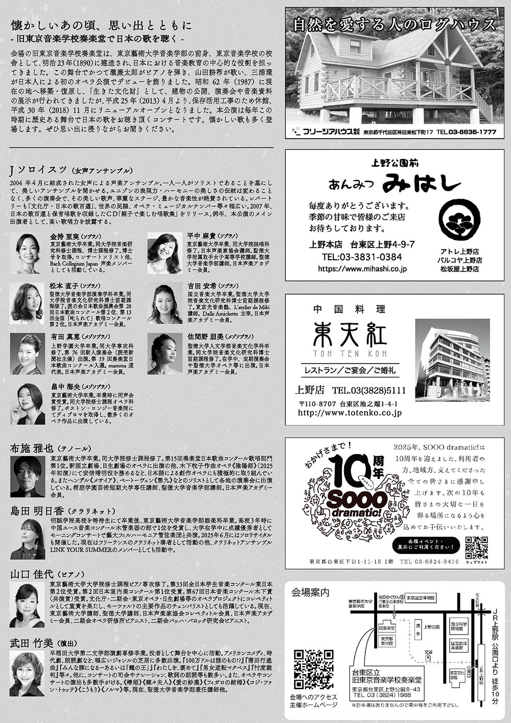 出演 Jソロイスツ(女声アンサンブル) 金持亜実 (ソプラノ) 平中麻貴 (ソプラノ) 松本直子 (ソプラノ) 吉田安希 (ソプラノ) 有田真恵 (メゾ・ソプラノ) 佐間野朋美 (メゾ・ソプラノ) 畠中海央 (メゾ・ソプラノ) 布施雅也 (テノール) 島田明日香(クラリネット) 山口佳代 (ピアノ) 武田竹美(演出) 高橋大海(監修) |