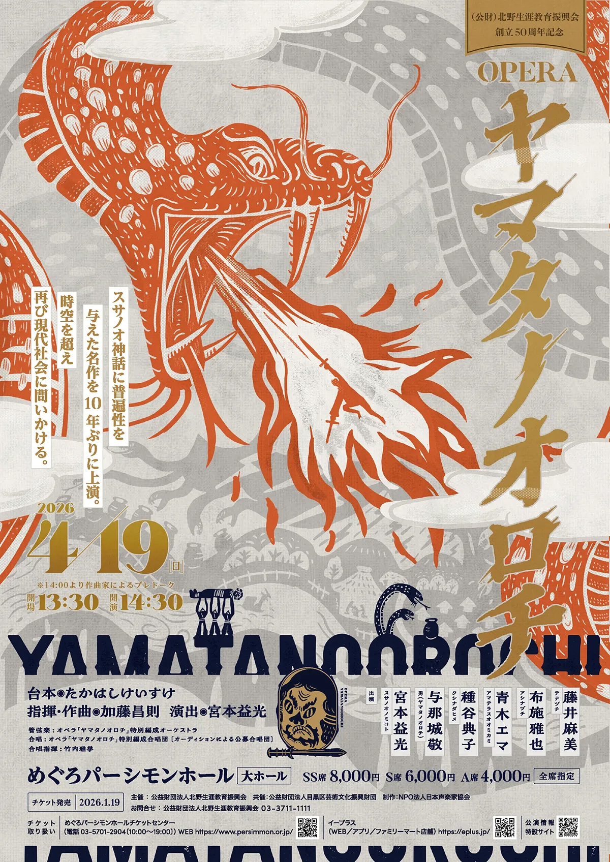 指揮・作曲 加藤昌則 台本 たかはしけいすけ 出演 宮本益光 (スサノオノミコト) 与那城敬 (ヤマタノオロチ) 種谷典子 (クシナダヒメ) 青木エマ (アマテラスオオミカミ) 布施雅也 (アシナヅチ) 藤井麻美 (テナヅチ) チラシ(PDF) |