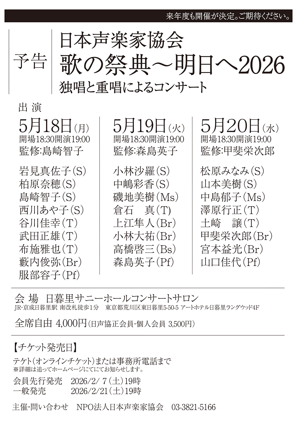 2026年5月19日(火) 18:30開場 19:00開演 日暮里サニーホールコンサートサロン |